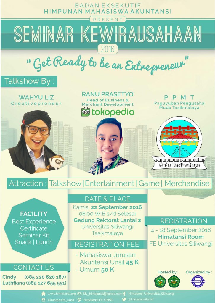 Seminar dan Talkshow dalam event Seminar Kewirausahaan 2016 dengan tema “Get Ready To Be An Entrepeuneur” Date and Place : Kamis, 22 September 2016 Pukul 08.00 WIB s.d Selesai Gd. Rektorat Lt 2 Universitas Siliwangi Tasikmalaya HTM : Mahasiswa jurusan Akuntansi UNSIL (45k) Umum (50k) Registrasi : Via SMS : Nama Lengkap_Jurusan/Universitas/Instansi kirim ke […]